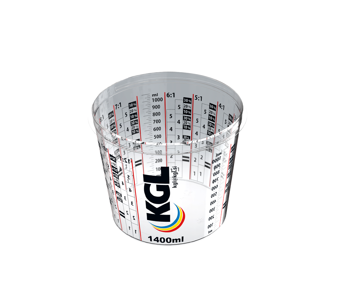 Mešalni lonček iz polipropilena, 1400 ml, odporen na barve in topila. Jasno vtisnjene merilne skale omogočajo natančno doziranje in homogeno mešanje barv in lakov.